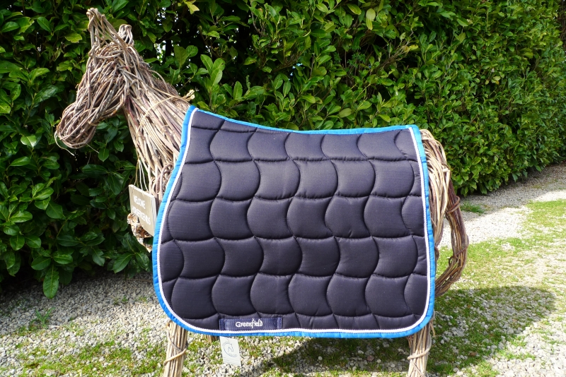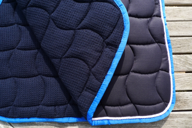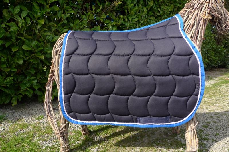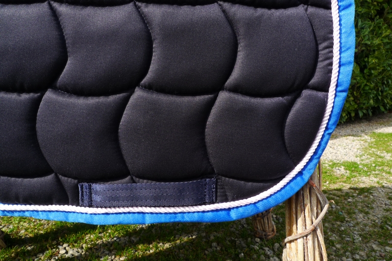 Schabracke dunkelblau, weiße Zierkordel, bordeauxrote BordeKlassische, royalblaue Schabracke mit Waffelsteppung und Zierkordel in weiß. Atmungsaktiv. Farbe:Blau mit weißer Zierkordel und bordeaux Borde |