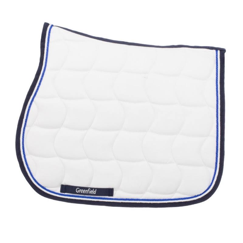 Klassische, weiße Tunierschabracke mit Waffelsteppung, dekorativer doppelter Zierkordel in royalblau/weiß und einer dunkelblauen Borde. Atmungsaktive und angenehme Sattelunterlage aus Baumwolle mit Schlaufen zur Sattelgurtbefestigung auf Höhe der Beinlage. Bis 30 °C in der Waschmaschine waschbar. Liegt sehr gut auf dem Pferd und bleibt in Form – auch nach dem Waschen.