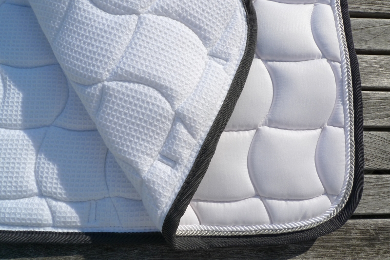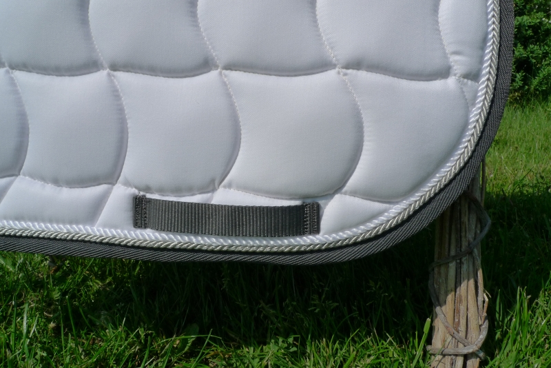 Dressurschabracke dunkelblau, 2 Zierkordeln weiß/silber, blaue BordeElegante, dunkelblaue Dressurschabracke mit Waffelsteppung, doppelter Zierkordel in weiß/silber und blauer Borde. Atmungsaktiv. Farbe: dunkelblau mit 2 Zierkordeln in silber/weiß und blauer Borde |