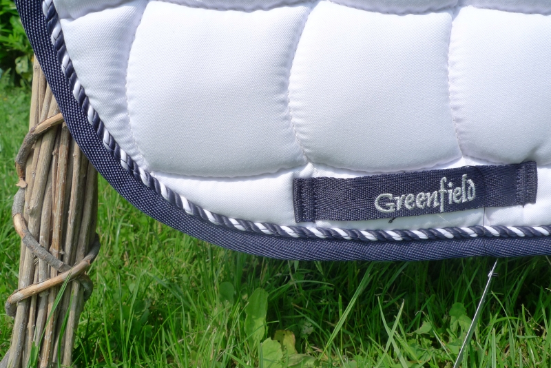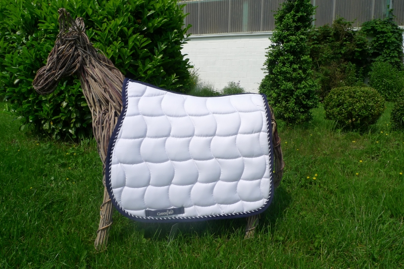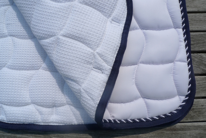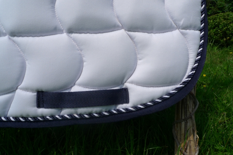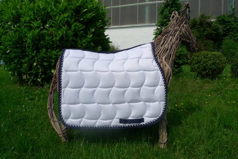 Stilvolle, weiße Schabracke mit Waffelsteppung, edler, 2-farbig, gedrehter Zierkordel in den Farben dunkelblau/weiß und einer dunkelblauen Borde. Hochwertige, atmungsaktive und angenehme Sattelunterlage aus Baumwolle mit Schlaufen zur Sattelgurtbefestigung auf Höhe der Beinlage. Maschinenwaschbar bis 30 °C. Liegt sehr gut auf dem Pferd und bleibt in Form – auch nach dem Waschen.